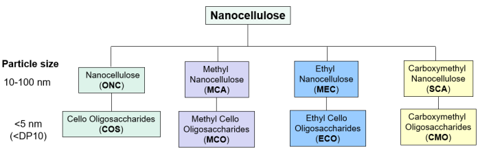 The principal distinction between nanocellulose and oligosaccharides is their solubility behavior. For example, nanocellulose (ONC) is insoluble in both water and common organic solvents, whereas COS is readily soluble in water. Ethyl nanocellulose (MEC) is insoluble in water but soluble in organic solvents, while ECO exhibits solubility in both aqueous and organic media, giving it amphiphilic character.